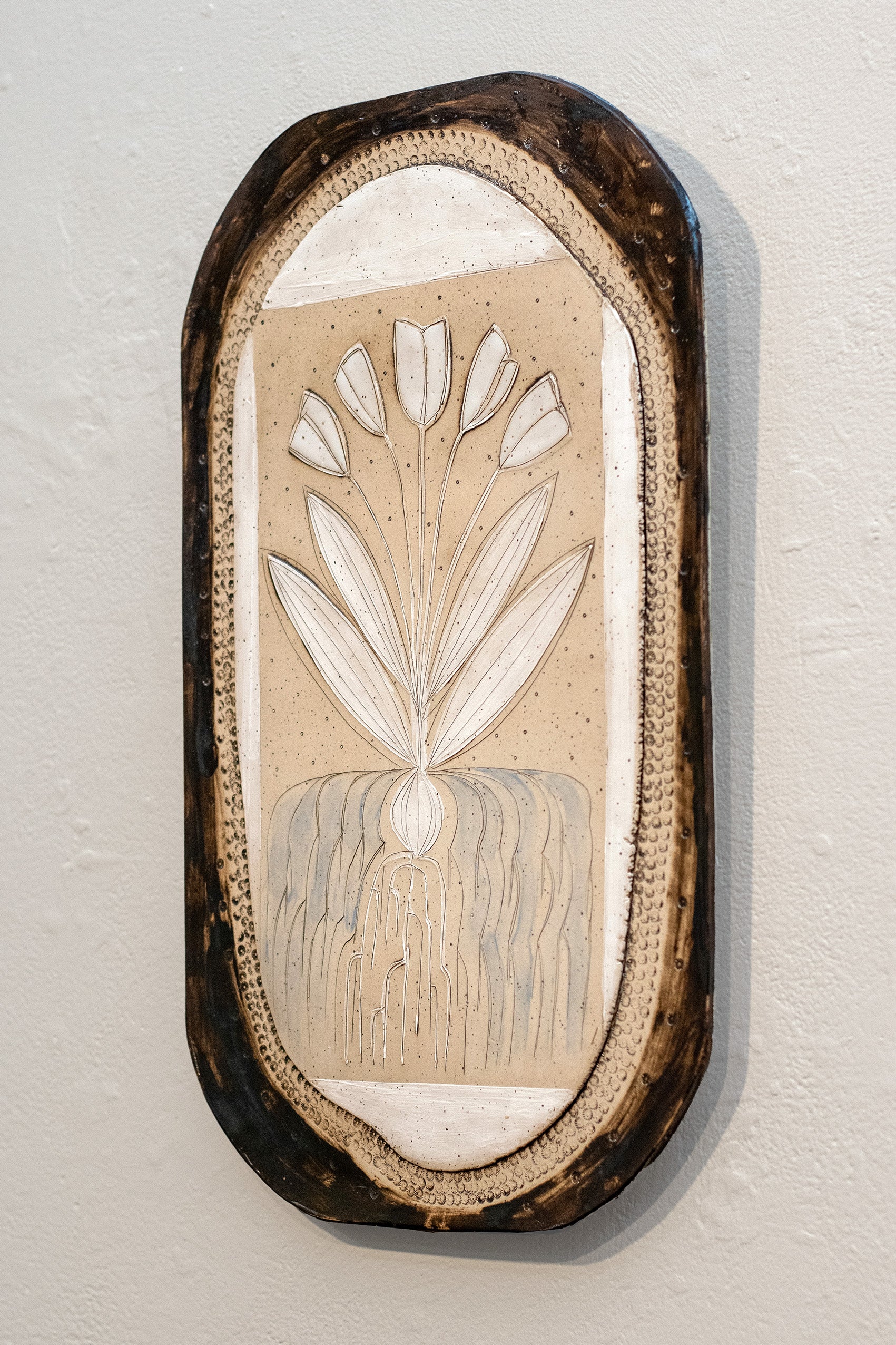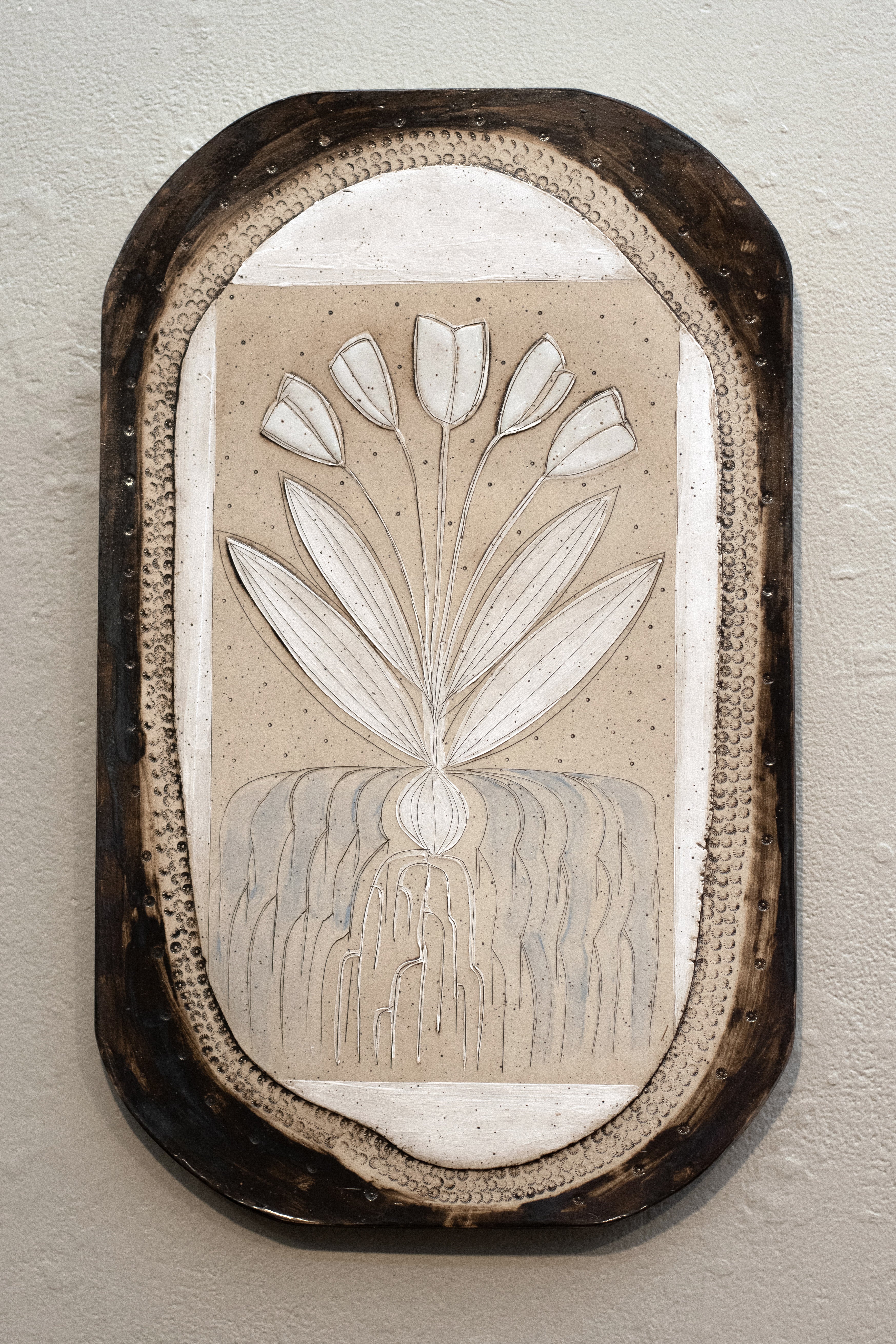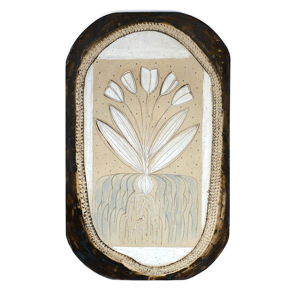Speckled stoneware with tinted underglaze and glaze frame and tulips.
